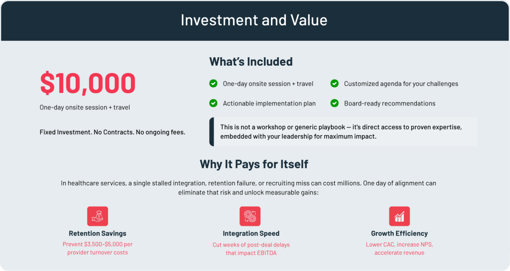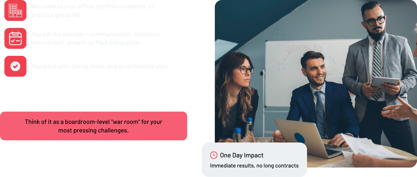 A one-day, onsite, drop-in advisory clinic for healthcare PE firms, MSOs, and DSOs.
